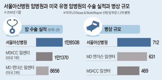국내 암환자들이 가장 많은 찾는 병원은 서울아산병원이다. 건강보험심사평가원의 연간 암 수술 실적에 따르면 우리나라 암 수술 중 약 10%가 서울아산병원 암병원에서 이뤄졌다. 주목할 만한 점은 세계적으로도 서울아산병원의 암 진료 기록은 독보적이라는 것이다. 서울아산병원 암병원(712병상) 수술실적은 지난 2012년 1만7267건, 2013년 1만7467건, 2014년 1만8508건으로 해마다 증가했다. 이는 미국 암치료 분야 1위로 선정된 메모리얼 슬로언 케터링 암센터(MSKCC·469병상)의 수술실적 1만1370건, 2위 MD 앤더슨 암센터(631병상)의 8656건보다 많은 수치다. 이미 세계 유수 의료기관의 의료진들이 서울아산병원으로 암 치료 기술을 배우기 위해 찾아온다. 서울아산병원에 왜 이렇게 암환자들이 몰리는지 그 이유를 분석해 봤다.