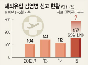 26일 질병관리본부에 따르면 이날까지 올해 해외유입감염병은 총 152건으로 지난해 같은 기간(1∼5월) 112건에 비해 35.7%가 증가했다. 지난 2012년 같은 기간의 경우 104건이었지만, 2013년 141건으로 늘었다가 2014년 소폭 줄었지만 올해 들어 다시 크게 늘었다.