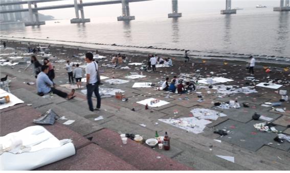 해안 절경으로 유명한 부산 수영구 민락 수변공원이 방문객들의 각종 무질서 및 불법행위로 몸살을 앓고 있다. 3만3000㎡에 달하는 민락 수변공원은 부산 광안대교의 야경이 한눈에 보이는 등 관광 명소로 부상해 이른 폭염에 더위를 식히려는 인파들로 매일 수천 명∼1만 명씩이 몰려들고 있다. 그러나 이 지역을 관할하는 부산 남부경찰서 광민지구대에 따르면 야간에 취객들의 시비, 안전사고 등으로 112신고가 폭주하는 등 많은 사건·사고가 발생하고 있다. 지난해 6월에는 청소년들 간에 시비를 벌이다가 살인사건이 발생하기도 했다. 모여드는 차량들로 인해 극심한 교통체증에다 불법주차도 극성을 부려 시내버스가 정차를 못하는 상황도 나오고 있다. 아침에는 각종 음식과 술병 등 곳곳에 흩어져 있는 쓰레기들로 몸살을 앓고 있다. 더운 날씨 때문에 음식물들이 부패해 악취가 진동하기도 한다. 수영공간이 아닌데도 물에 뛰어드는 등 추태도 발생하고 있다. 매일 격무에 시달리며 각종 범죄 및 안전사고에 대비 하고 있는 광민지구대 김민주 순경은 “아름다운 수변공원이 일부 몰지각한 방문객들 때문에 훼손되고 다른 방문객들에게도 피해를 끼쳐 안타깝다”고 말했다. 따라서 김 순경은 “대중교통을 이용하면서 쓰레기를 깨끗이 정리하고, 과도한 음주를 자제하는 등 시민의식이 있어야 수변공원의 가치가 더욱 높아질 것”이라고 당부했다.