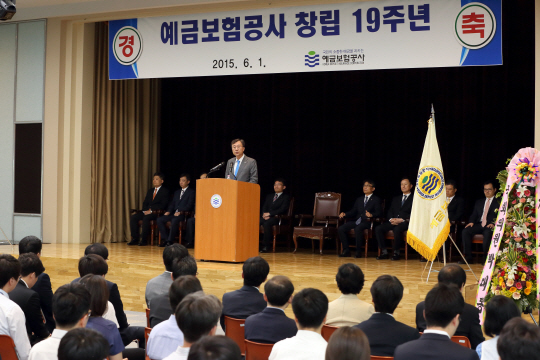 곽범국 예금보험공사 사장이 1일 서울 중구 청계천로 사옥에서 열린 ‘창립 19주년 기념식’에서 “임직원이 단합하여 세계 최고의 일등 예금보험공사로 거듭날 수 있게 최선을 다하자”고 강조하고 있다.