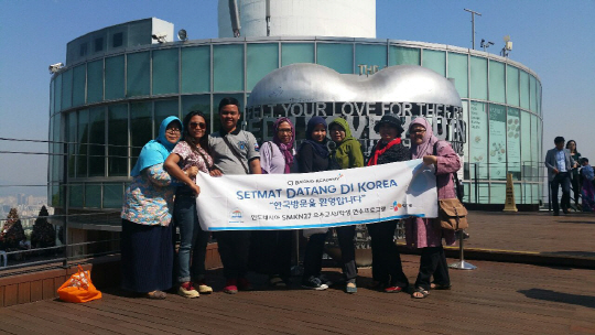 CJ푸드빌이 설립한 ‘인도네시아 CJ제과제빵학과’의 1기 졸업생들이 4박 5일 동안 진행된 한국 초청행사를 마친 지난 5월 30일 서울 남산 N서울타워를 찾아 기념촬영을 하고 있다.