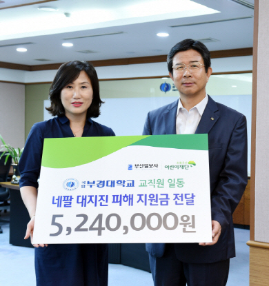 김영섭(오른쪽) 부경대 총장은 11일 오후 3시 부산 남구 교내 대학본부 3층 총장실에서 초록우산 어린이재단 부산지역본부 이수경 본부장에게 네팔 지진피해 아동 지원금 524만 원을 전달했다.
