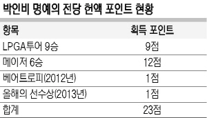 1950년 출범 후 미국여자프로골프(LPGA) 투어에서 명예의 전당에 오른 건 지금까지 35명뿐이다. 명예의 전당에는 박세리(38)가 지난 2007년 한국인으론 처음으로 발을 들여놓았다. 당시에는 명예의 전당에 가입하기 위해 3가지의 까다로운 조건을 충족시켜야 했다. 10년 이상 현역으로 투어에 참가해야 하고, 메이저대회와 베어트로피(최저타수상) 또는 올해의 선수상 중 하나를 수상해야 하며, 우승 포인트 27점을 획득해야 했다. LPGA 투어는 메이저대회에서 우승하면 2점, 투어 대회에서 우승하면 1점, 올해의 선수상 또는 베어트로피를 수상하면 각각 1점씩 명예의 전당 포인트를 수여한다.