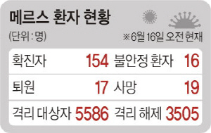 국내 중동호흡기증후군(메르스) 환자가 4차 감염자를 포함해 154명으로 늘었고, 최대잠복기인 2주를 지나서도 확진자가 나오고 있다. 메르스 퇴원자도 3명이 추가됐지만, 지병이 없는 환자를 포함한 사망자도 3명이 늘어 치사율이 증가했다. 또 그동안 메르스 청정지역이었던 곳에서도 확진자가 발생하는 등 사태가 꾸준히 이어지고 있다.