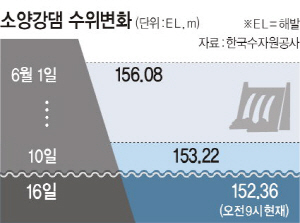 한국수자원공사에 따르면 16일 오전 9시 현재 소양강댐 수위는 152.36m로 저수위인 150m를 불과 2m36cm 남겨두고 있다. 지난 1978년 기록했던 최저수위인 151.93m까지는 43cm 남았다. 저수위는 댐이 정상적으로 운영되는 기준이 되는 지점이다. 저수위를 밑돌면 용수공급이 제한을 받게 되고, 기술적으로 발전기를 돌릴 수 없어 전기 생산이 중단될 수밖에 없다. 국토교통부는 지난 11일부터 화천댐 등 발전댐 여유 물량을 내려보내는 대신 소양강댐 등 한강수계 다목적댐의 방류량을 줄여 이들 댐의 용수공급 부담을 덜어주는 긴급대책을 가동하고 있지만, 그 이후에도 소양강댐 수위는 꾸준히 떨어지고 있다. 지난 1일 156.08m였던 댐 수위는 11일 153.04m, 15일 152.37m로 낮아졌다.
