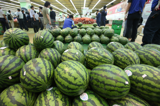 가뭄으로 각종 채소 값이 폭등하고 있는 가운데 17일 서울의 한 대형 마트 과일 매장에 최근 제철을 맞아 소매가격이 크게 오른 수박이 진열돼 있다.