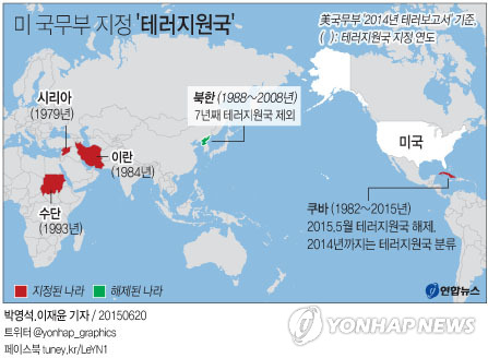 국무부 보고서 기준으로 북한이 테러지원국 명단에서 제외된 것은 2008년 10월 북·미 간 핵프로그램 검증 합의 직후 명단에서 빠진 이래 7년째다. 쿠바는 지난달 국무부의 테러지원국 지정해제 결정에 따라 명단에서 공식 제외됐으나 2014년까지는 테러지원국으로 분류됐다.
