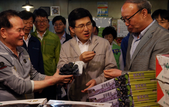 26일 오전 서울 송파구 가락농수산물도매시장을 방문한 황교안(가운데) 국무총리가 한 과일가게에서 거봉포도를 먹어보고 있다.