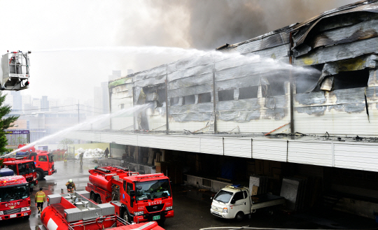 26일 오전 6시 48분쯤 경기 화성 동탄면 하나로마트 물류창고 1층에서 불이 나 소방대원들이 진화작업을 벌이고 있다. 지금까지 인명피해는 없는 것으로 알려졌다.