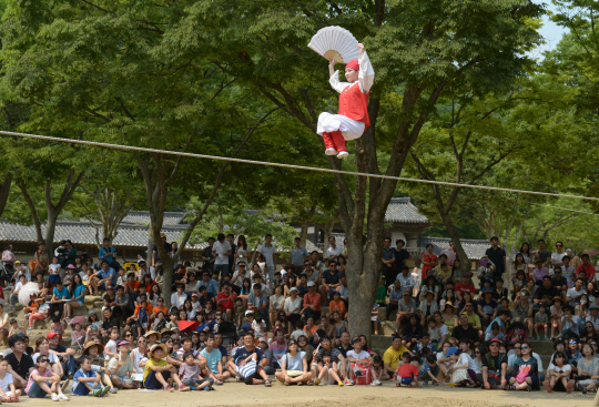 중동호흡기증후군(메르스) 확산세가 주춤한 가운데 28일 경기 용인시 한국민속촌에 휴일을 맞아 몰려든 관람객들이 줄타기 공연을 감상하고 있다.