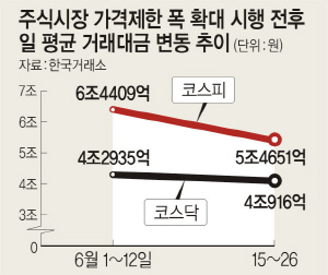 30일 한국거래소에 따르면 가격제한폭 확대 시행 후 2주 동안 코스피의 하루평균 거래대금은 5조4651억 원으로 집계됐다. 이는 확대 시행 직전 2주 동안의 하루평균 거래대금 6조4409억 원과 비교해 1조 원(15.1%) 가까이 감소한 수치다.