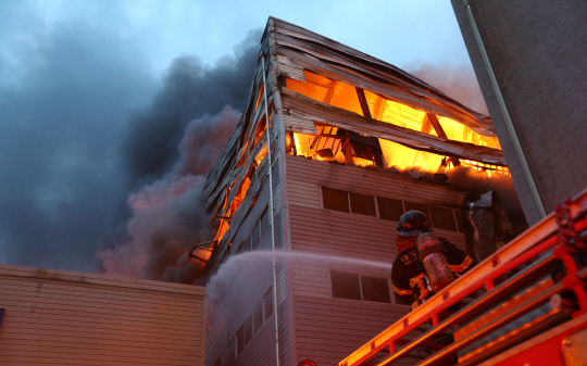 29일 오후 대구 북구 검단동 검단공단에 있는 수입 침구류업체 보관창고에서 대형 화재가 발생해 소방관이 물을 뿌리며 진화 작업을 벌이고 있다.