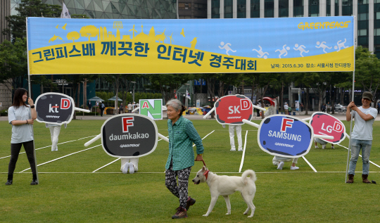 30일 오전 서울 광장에서 국제환경보호단체 그린피스가 정보기술(IT)기업에 재생 가능 에너지 사용을 요구하는 의미로 주최한 ‘깨끗한 인터넷 경주대회’를 열고 있는 동안, 한 시민이 애완견을 끌고 지나가고 있다.
