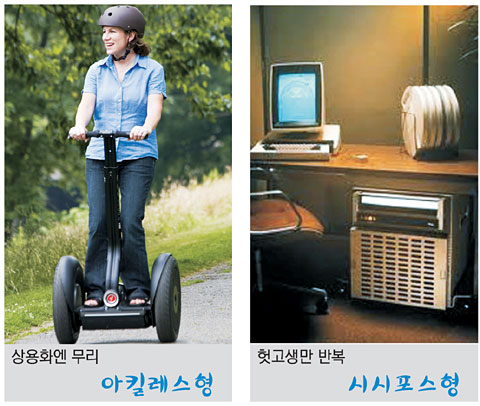 아킬레스형은 상용화에 치명적인 약점을 간과해서 발생하는 실패 유형이다. 미국 벤처업체 세그웨이가 2001년 내놓은 1인용 전동 스쿠터 세그웨이는 출시 당시 ‘출퇴근 풍경을 바꿀 획기적 제품’ ‘인터넷 이후 최고의 발명품’이라는 찬사를 받았으나 5개월 동안 6000대 판매에 그치며 실패했다. 대다수 국가는 세그웨이가 너무 빠르고 부피가 크다는 이유로 인도에서 운행을 허용하는 법규를 마련하지 않았다. 심지어 2003년 조지 W 부시 전 미국 대통령이 세그웨이를 타다 넘어지는 장면이 보도되면서 TV의 개그 소재로 전락했다.