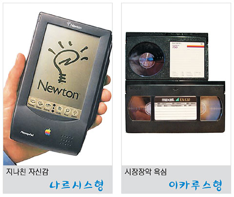 이카루스형은 시장을 장악하려는 과도한 욕심으로 자사가 개발한 기술을 시장에 일방적으로 강요하거나 기술개발의 폐쇄성을 고집할 때 발생하는 실패 유형이다. 소니의 베타맥스 비디오 녹화 기술 등이 대표적이다. 1975년 홈 비디오 시대가 개막되면서 소니는 베타맥스 테이프를 개발해 시장 선점을 노렸다. 경쟁 기술은 마쓰시타(파나소닉)가 주도하는 VHS. 베타맥스는 VHS에 비해 크기가 작아 휴대성이 뛰어났고 화질 측면에서도 우월했다.