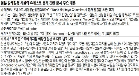 또 강제노역의 주체에 대해서도 ‘일본’이라고 돼 있지, ‘일본 정부’라고 명확하게 표시돼 있지 않다. 다음 문장에서 “2차 세계대전 당시 일본 정부도 징용 정책을 시행했다”고 표현하는 방식으로 간접적으로 시사하고 있을 뿐이다. 결국 한국으로서는 제대로 된 성과를 얻지 못한 상태에서 일제강점기 조선인들이 강제 노역했던 군함도 탄광 등 7개 시설이 이번에 함께 세계유산으로 등재되는 것을 허용한 셈이 됐다.