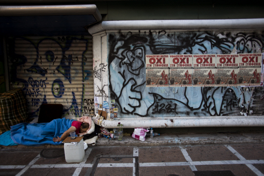 그리스 국민투표에서 채권단 협상안 수용 반대 결정이 나온 가운데 6일 그리스 아테네의 한 노숙자가 ‘아니요’를 뜻하는 그리스어 ‘오히(oxi)’ 포스터가 붙은 문 닫힌 가게 앞에 누워 있다.