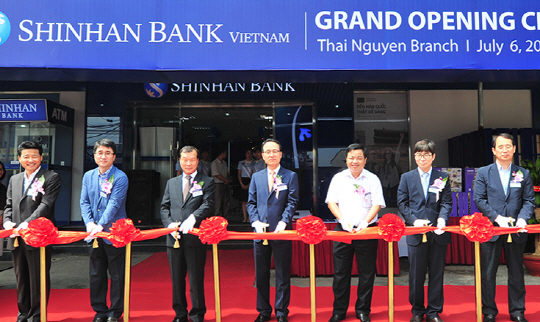 이기준(왼쪽 네번째) 신한은행 부행장이 6일 베트남 타이응우옌에서 신한베트남은행 타이응우옌지점 개점식을 기념하며 주요 내외빈들과 테이프를 자르고 있다.