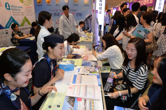 30일 오전 서울 강남구 삼성동 코엑스에서 열린 ‘2016학년도 수시 전문대학 입학정보 박람회’를 찾은 고교생들이 경북전문대 항공운항서비스학과의 체험을 하고 있다.