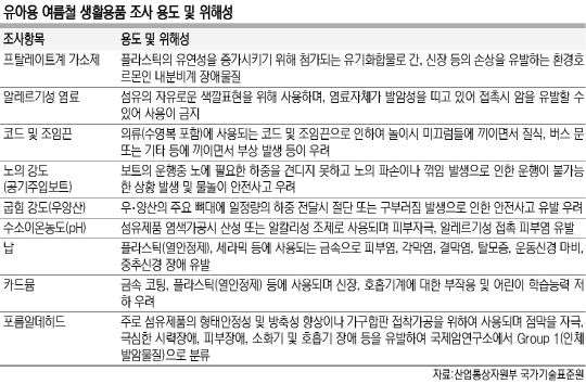 유아용 모자에서는 시력 장애를 유발하는 포름알데히드가 포함됐거나 유아가 입에 넣으면 질식할 수 있는 장식품이 달린 제품이 안전 기준을 벗어났다. 완구 제품 4개에서는 언어장애 등을 유발하는 납 성분이나 프탈레이트 가소제가 나왔고, 아동용 여름 의류 제품 4개는 의류 원단에서 알레르기성 피부염을 유발하는 수소이온농도(pH)가 안전기준을 초과했다.
