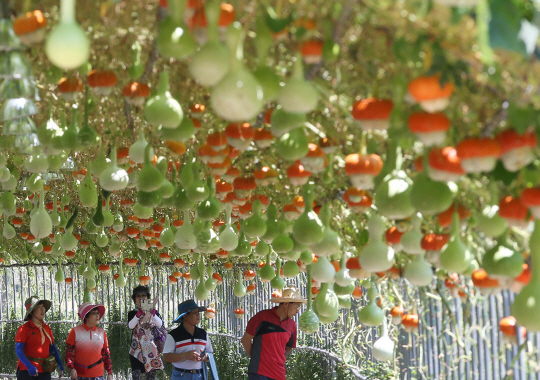 5일 울산 태화강대공원에 조성된 덩굴식물 터널에서 시민들이 영글어가는 열매들을 구경하고 있다. 이 덩굴식물 터널은 울산시농업기술센터가 태화강대공원 십리대밭 옆 250m에 관상용 호박, 조롱박, 수세미, 여주 등 11가지의 덩굴식물을 심어 조성한 것이다.
