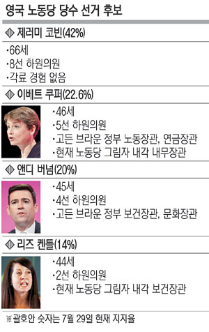 ◇‘초비상’노동당, ‘표정관리’ 보수당 = 코빈이 당수로 선출될 수도 있다는 사실에 노동당 주류와 지도부는 패닉상태에 빠져있다. 블레어 전 총리는 “코빈에 흔들리는 심장을 가진 당원은 이식수술을 받아라”며 반코빈 노선을 분명히 했다. ‘제3의 길’을 제시하면서 노동당 13년 정권을 창출했던 블레어는 최근 “전통적인 좌파 공약으로는 승리할 수 없고 낡은 좌파 공약이 승리로 이끌더라도 그런 노선을 택하지 말아야 한다”면서 “국민은 낡은 좌파 공약을 더 이상 이해할 수 없기 때문에 우리(노동당)에게 투표하지 않을 것”이라고 주장했다. 노동당의 ‘로열 패밀리’로 꼽히는 키녹 집안 출신의 닐 키녹 하원의원 역시 최근 옵서버에 기고한 글에서 “우리는 지금 토론을 이끌 사람을 뽑는 게 아니라 2020년 총선에서 노동당의 승리를 이끌 지도자를 뽑는 것”이라면서, 당원들이 비현실적인 환상에 사로잡혀 있을 때가 아니라고 호소했다. 앨런 존슨 전 내무장관은 “당장 (코빈 지지의) 미친 짓을 끝내야 한다”고 주장했다.