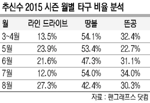 추신수는 20일까지 8월 들어 치른 16게임에서 3할대 타율과 4할대 출루율, 5할대 장타율을 남기고 있다. 6월 타율 0.225, 7월 타율 0.262에 불과했던 추신수가 달라진 비결은 뭘까. ‘라인 드라이브(직선타)’ 비중이 높아지면서 땅볼이 줄었고, 볼넷을 골라내는 선구안을 되찾은 게 가장 큰 변화다.