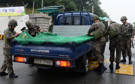 북한의 ‘8·20 연천 포격 도발’로 인해 군의 경계태세가 강화된 가운데, 21일 오전 서울 용산구 국방부 청사 입구에서 경계병들이 차량을 검문검색하고 있다.