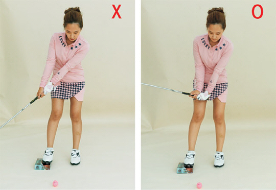 왼발 내리막 어프로치 상황이라면 정상적인 스윙으로 좋은 결과를 얻을 수 없습니다. 왼발이 낮고 오른쪽이 높은 지형에 볼이 있다면 어드레스 자세에 신경 써야 합니다.