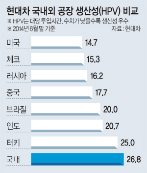미국공장이 14.7로 가장 생산성이 높았고 체코 15.3, 러시아 16.2, 중국 17.7, 브라질 20.0, 인도 20.7, 터키 25.0 등의 순이었다. 국내 공장은 2011년 31.3에서 2012년 30.5, 2013년 27.8 등으로 조금씩 효율성이 높아지고 있지만 여전히 현대차 전 세계 공장 중 가장 낮은 생산성을 기록해 아직 가야 할 길이 먼 실정이다.