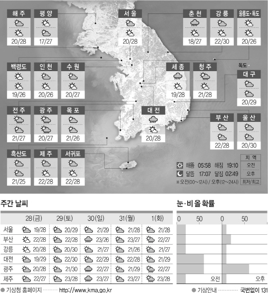 전국에 구름이 많겠고 새벽부터 오후 사이에 강원 영서와 충남·북, 전남·북 등에서 비(강수확률 60∼70%)가 오는 곳이 있겠다. 오후부터는 가끔 구름이 많겠다. 아침 최저기온은 17도에서 22도, 낮 최고기온은 26도에서 30도가 되겠다.