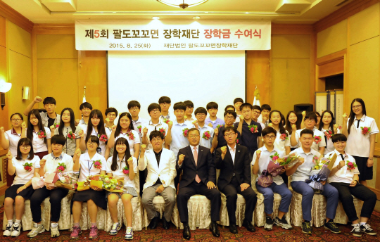 최재문(앞줄 오른쪽 다섯 번째) 팔도 꼬꼬면장학재단 이사장과 이경규(〃〃여섯 번째) 이사 등이 25일 전북 전주시 완산구 기린대로 르윈호텔에서 ‘제5회 팔도 꼬꼬면 장학재단 장학금 수여식’을 열고 97명의 고교생에게 7000만 원의 장학금을 지급했다.