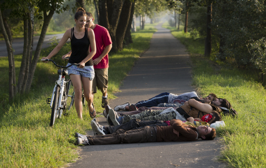 30일 헝가리-세르비아 국경지대인 모라할롬에 위치한 자전거 도로에서 길 한가운데서 잠을 자고 있는 아프가니스탄 출신의 남성 불법 이주민들을 피하기 위해 지역 주민들이 자전거를 끌고 가고 있다. 아프리카와 중동지역에서 밀려드는 난민들로 유럽 각국이 몸살을 앓고 있다.