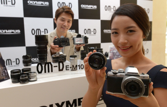 31일 오전 서울 중구 웨스틴조선호텔에서 열린 올림푸스 카메라 신제품 발표회에서 모델들이 ‘OM-D E-M10 마크2 플래그십 미러리스 카메라’를 선보이고 있다.