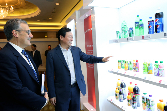 신동빈(오른쪽) 롯데그룹 회장이 31일 서울 잠실 롯데호텔에서 열린 ‘2015 롯데 마케팅 포럼’에서 글로벌컨설팅회사인 AT커니의 폴 로디시나 명예회장에게 롯데제품의 패키지 디자인에 대해 설명하고 있다.