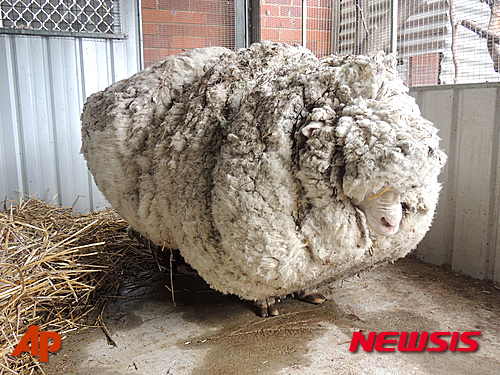 호주의 관목 숲에서 길을 잃고 혼자 6년 간 살아온 메리노종 양 ‘크리스’가 3일 캔버라에서 무려 42㎏ 무게의 털을 깎기기 전 대기하고 있다.
