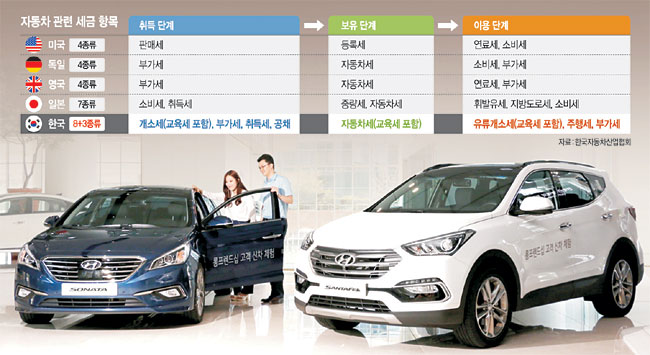 특히 자동차 선진국과 비교하면 우리나라 세제의 복잡성은 확연하다. 미국의 자동차 조세 체제는 판매세(취득), 등록세(보유), 연료세·소비세(이용)로 이뤄져 있고 독일과 영국 역시 부가세(취득), 자동차세(보유), 소비세 또는 연료세·부가세(이용)로 구성되는 등 세금 항목이 4종류를 넘지 않는다. 우리와 세금 체제가 비슷한 일본의 경우에도 취득 단계에서 소비세·취득세, 보유 단계에서 중량세·자동차세, 이용 단계에서 휘발유세·지방도로세·소비세 등 자동차 관련 세금 항목이 7종류에 불과한 것으로 나타났다.