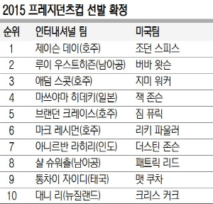 한편 이번 대회를 끝으로 오는 10월 둘째 주 인천 송도 잭니클라우스 골프장에서 열리는 2015 프레지던츠컵에 출전할 인터내셔널팀과 미국팀의 자동출전 선수 10명씩이 모두 확정됐다. 인터내셔널팀은 1위 데이 등 호주 선수 3명과 루이 우스트히즌(33) 등 남아프리카공화국 선수 3명이 주축을 이룬 가운데 일본, 인도, 태국, 뉴질랜드 선수 1명씩이 포함됐다. 닉 프라이스 인터내셔널팀 단장과 제이 하스 미국팀 단장은 9일 오전(한국시간) 기자회견을 통해 추천 선수 2명을 발표하며 선수단 명단을 최종 확정한다.