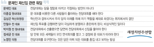 문 대표 측은 전당대회를 개최하자는 것은 당을 분열시키는 행동이라며 반박했다. 문 대표는 전당대회는 당을 정말로 아끼고 걱정하는 방안이 아니라고 지적했고, 지난 대선에서 문재인 캠프 비서실장을 지낸 노영민 의원은 이날 MBC 라디오와 인터뷰에서 “재신임이 되지 않으면 임시 전당대회로 가면 된다”고 말했다. 노 의원은 “전당대회를 지금 단계에서 요구한다는 것은 당은 어찌 되든 일단 대표를 흠집 내고 보자는 발상”이라며 “잿밥에만 관심 있는 극소수의 의견일 뿐”이라고 비난했다. 한 당직 의원은 “전당대회를 열자는 것은 퇴진을 전제로 하자는 것으로 있을 수 없는 얘기”라고 말했다. 한편 김상곤 혁신위원장은 문 대표의 재신임 안에 대해 “혁신안과 결부시켜서 우리 당의 미래를 위해 자기 역할을 제대로 하겠다는 취지에서의 결단이라고 생각한다”고 밝혔다.