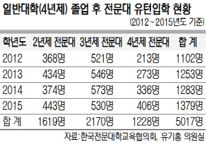 4년제 대학을 졸업한 뒤 전문대로 다시 돌아간 학생은 올해 1379명으로 가장 많았다. 2014년 1283명, 2013년 1253명, 2012년 1102명 등 해마다 증가하고 있다. 전문대로 다시 입학한 학생들이 가장 선호하는 학과는 간호학과였으며 물리치료과, 유아교육과, 사회복지과, 생명환경화공과, 안경광학과, 치위생과, 협동조합경영과 등도 선호도가 높았다. 이들 학과는 취업이 잘되는 학과로 평가된다.