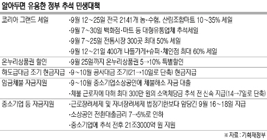 정부가 15일 국무회의에서 발표한 ‘추석 민생대책’은 이번 추석 명절 기간을 계기로 그간 지지부진하던 내수 회복세를 공고히 해 경제 심리를 되살리는 한편 특히 서민층이 회복된 경기를 체감할 수 있도록 하는 데 초점을 맞췄다.