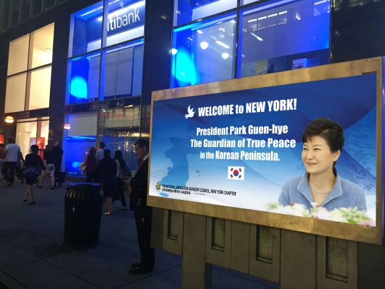 박근혜 대통령이 오는 25일 유엔 총회 등에 참석하기 위해 미국 뉴욕을 방문할 예정인 가운데 21일 뉴욕 맨해튼 거리 한가운데 박 대통령의 방문을 환영한다는 광고가 게시돼 있다. 이 광고는 민주평통 뉴욕협의회가 의뢰해 제작한 것으로 ‘박근혜 대통령은 한반도의 진정한 평화 수호자’라는 문구가 새겨져 있다.