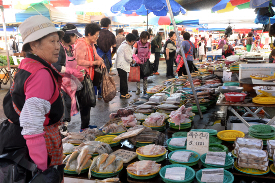 추석을 사흘 앞둔 24일 오전 국내 최대 오일장인 경기 성남시 모란시장에 추석에 쓸 제수용 생선을 사러 나온 시민들이 생선을 고르고 있다.