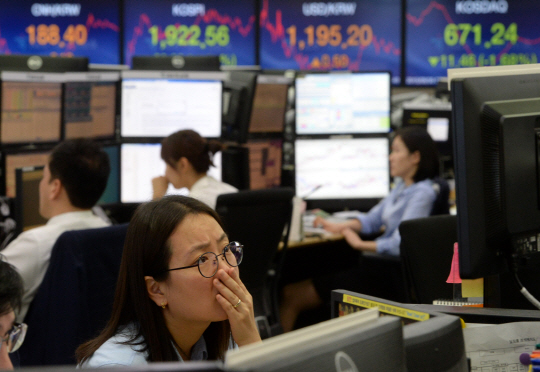 추석 연휴가 끝나고 개장한 코스피와 코스닥이 글로벌 주요 증시 동반 부진에 1%대가 넘는 내림세로 출발한 가운데 30일 오전 서울 중구 KEB 하나은행 본점 딜링룸에서 한 직원이 모니터를 주시하고 있다.