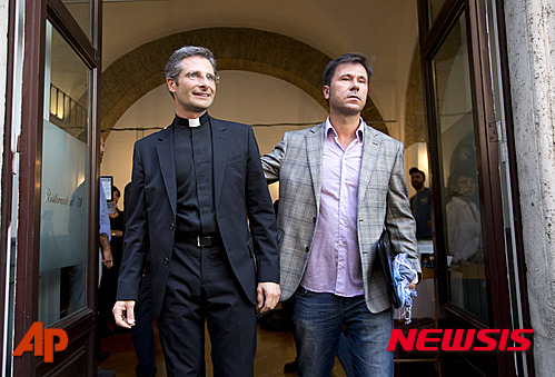 교황청 신앙교리성에서 활동하는 크리스토프 카람사 신부(왼쪽)가 3일(현지시간) 이탈리아 로마에서 동성애인 에두아르드(오른쪽)와 함께 기자회견을 열어 동성애자임을 밝힌 후 나란히 회견장을 걸어나오고 잇다.