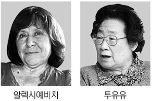 또 우크라이나 태생의 벨라루스 작가 스베틀라나 알렉시예비치(여·67)는 지난 8일 저널리스트 출신으로서는 최초로 노벨문학상 수상의 영예를 안아 많은 이을 놀라게 했다. 알렉시예비치는 주로 사회주의 체제의 몰락과 전쟁 등에 대한 여러 사람의 증언을 논픽션 형식으로 쓰는 다큐멘터리 산문 작가로, 대표작으로는 ‘전쟁은 여자의 얼굴을 하지 않았다’, ‘체르노빌의 목소리’ 등이 있다. 논픽션 작가가 노벨문학상을 수상한 것은 지난 1964년 장폴 사르트르 이후 처음으로, 외신들은 “이례적”이라는 평가를 잇달아 내놓고 있다. 이 때문에 일각에서는 “이번 노벨문학상은 알렉시예비치가 반(反)러시아 인사라는 점 등을 고려한 정치적 상이 아니냐”는 비판의견이 나오고 있다.