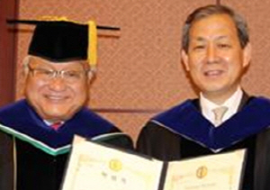 김인철(사진 오른쪽) 한국외국어대 총장은 지난 8일 미국 워싱턴DC 국회의사당 회의실을 방문해 마이크 혼다 의원에게 명예 정치학박사 학위를 수여했다. 혼다 의원은 미국 의회에서 55건의 일본군 위안부 문제 관련 결의안이 통과되는 데 커다란 영향을 끼쳤다.