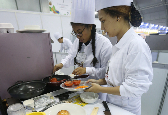 11일 경기 남양주시 남양주체육문화센터에서 열린 ‘2015 남양주 슬로라이프 국제대회’ 요리경연 행사에 참여한 외국인 부문 참가자들이 출품 요리를 만들고 있다.