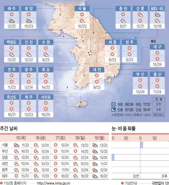전국이 대체로 맑겠다. 아침 최저기온은 4도에서 15도, 낮 최고기온은 20도에서 25도가 되겠다.