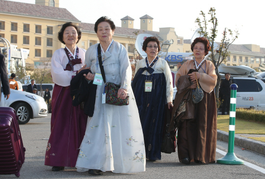 제20차 이산가족 상봉행사 1회차 첫날인 20일 오전 강원 속초시 한화리조트에서 남측 가족들이 금강산으로 가는 차량에 탑승하기 위해 이동하고 있다.